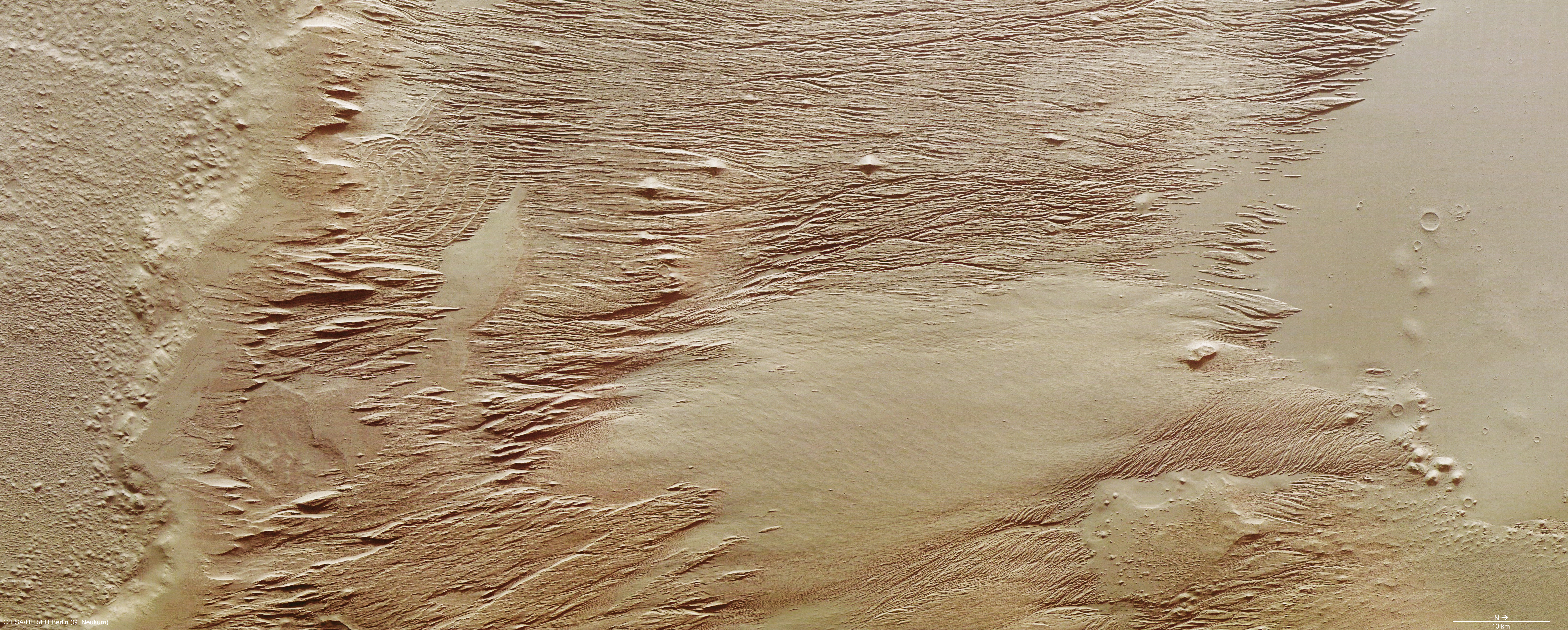The High Resolution Stereo Camera on board ESA's Mars Express has imaged the Eumenides Dorsum mountains on Mars. This image shows part of the mountain region.