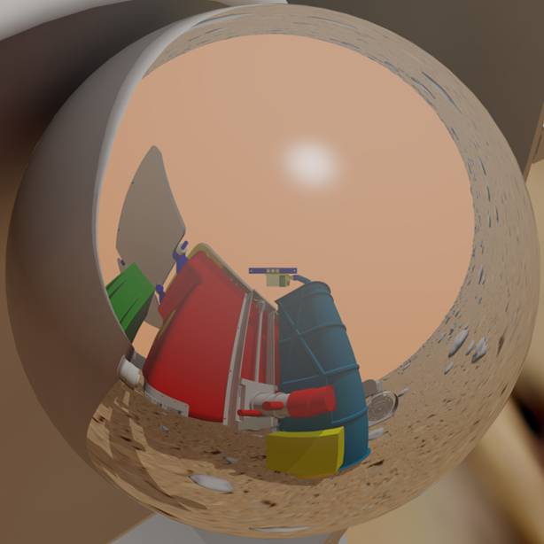 PanCam is supplemented by a 5-cm diameter calibration target and by a small spherical mirror, the Rover Inspection Mirror, which enable the camera to capture images of every angle of the Rover. The images taken are then processed and can be used to check the status of the Rover. This image shows a sample of the Rover Inspection Mirror view which will then be flattened to have a clear view on specific parts of the Rover.