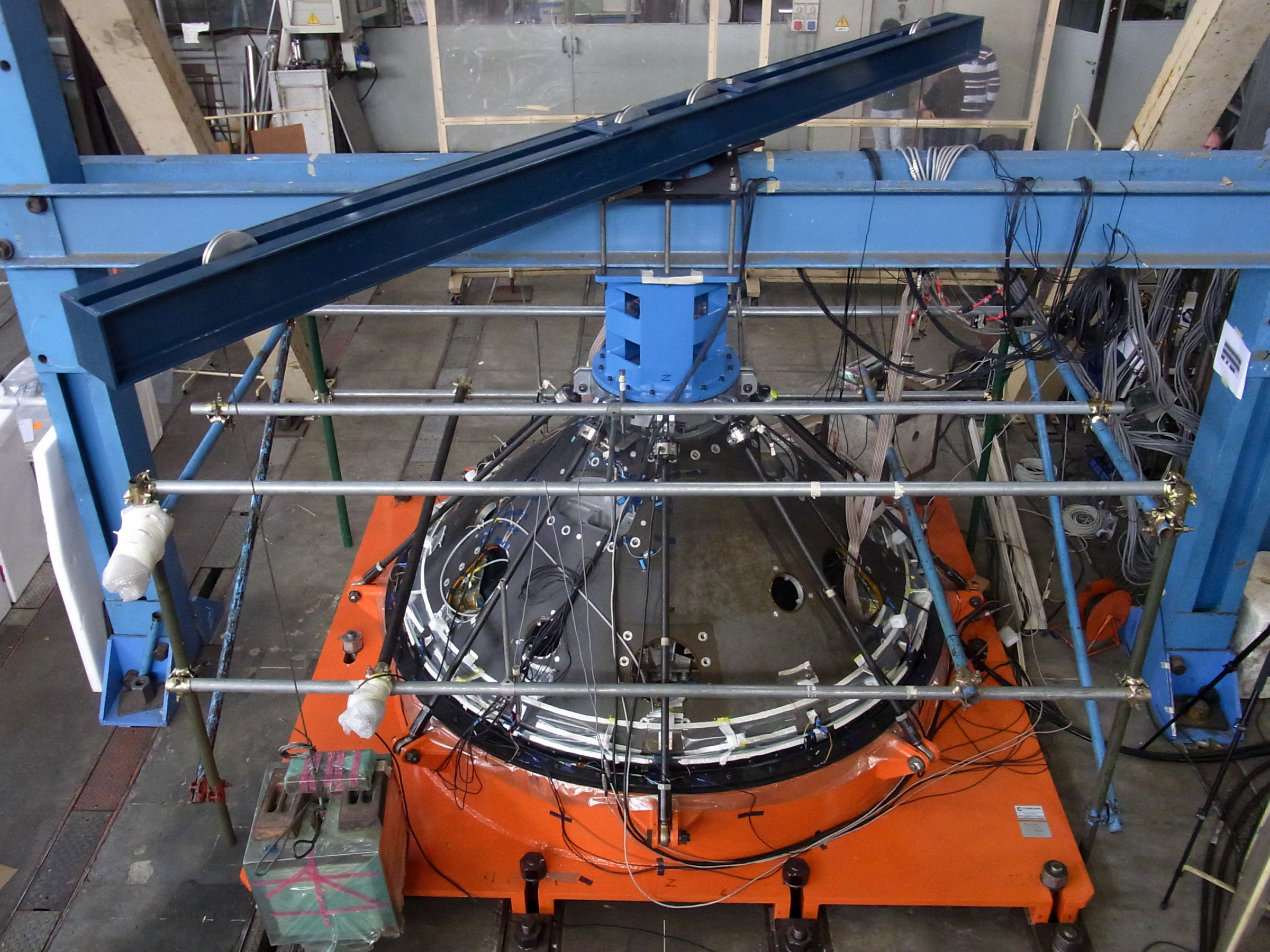 The ExoMars Entry, Descent and Landing Demonstrator Module (EDM) Structural Model during the entry load test. The air bag used to simulate the aerodynamic forces on the heat shield is hidden inside the orange test rig.