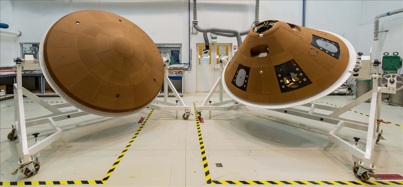 The Schiaparelli module will have two heat shields, front and rear, to protect the capsule during its descent through the Martian atmosphere. The heat shields have been developed by the Space Systems teams at Airbus Defence and Space, primarily at its site in Saint-Médard-en-Jalles, near Bordeaux (France). This photo of the two heat shields was taken during the final phase of production.