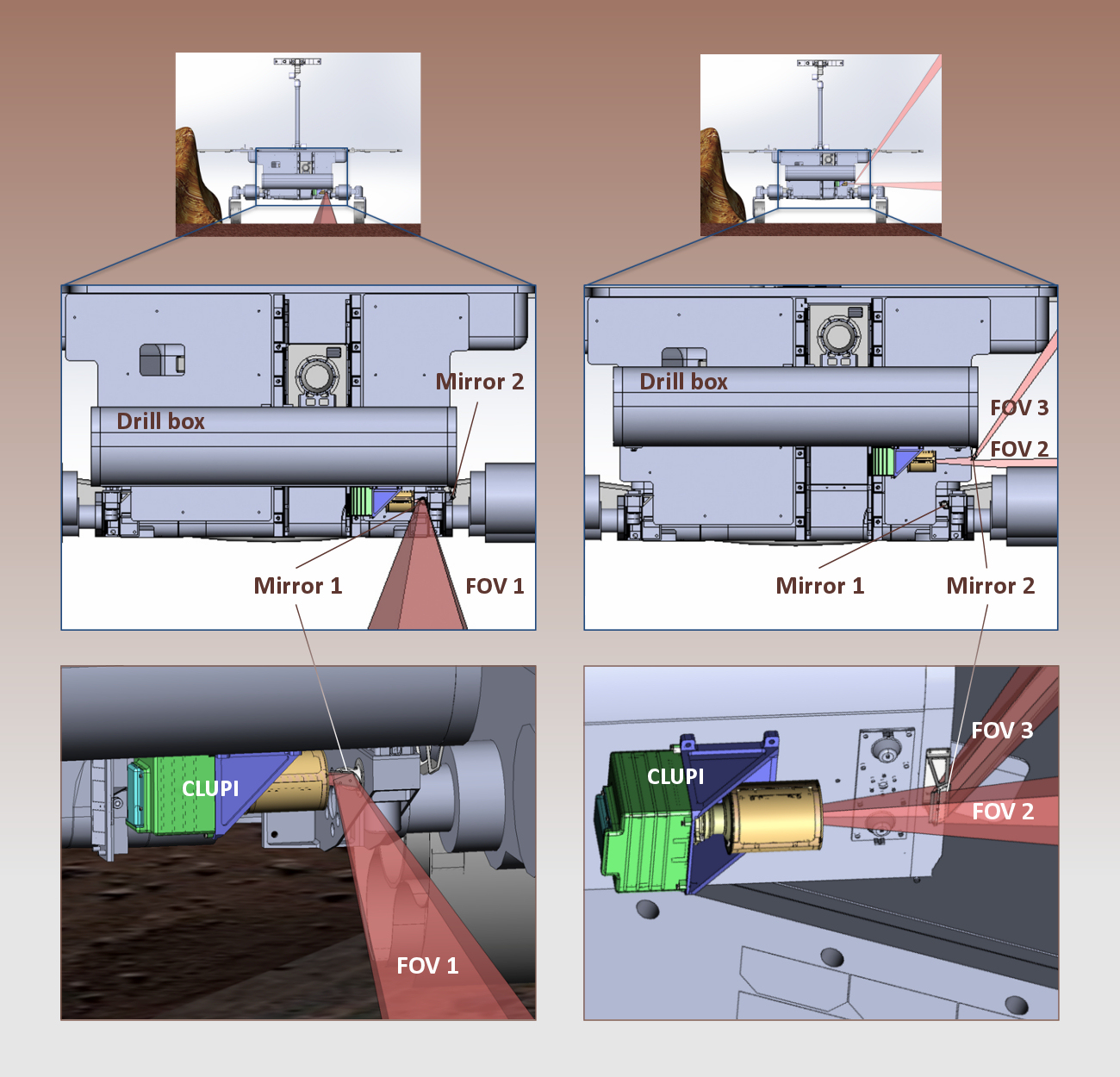 Located on top of the drill box, CLUPI will be angled and raised by using the degrees of freedom provided by both the rover and the drill box, so it can observe in a variety of viewing modes. The use of two fixed mirrors – one flat and one concave – will provide three fields of view (FOV).