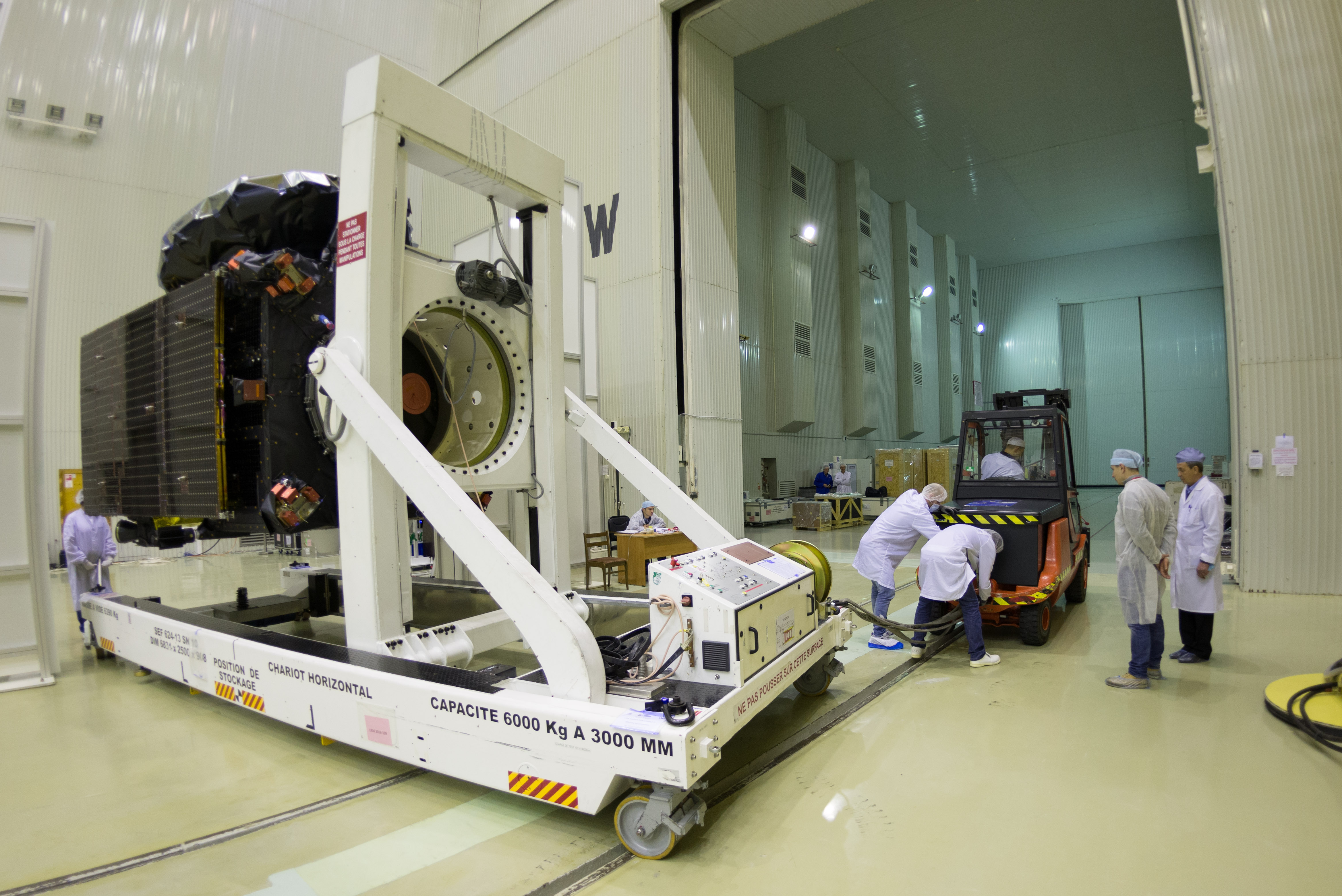 Moving the ExoMars 2016 Trace Gas Orbiter from one hall to another at the Baikonur Cosmodrome in Kazakhstan. The orbiter was being moved to the fuelling area for a leak test - one of a series of tests that are being carried out in preparation for launch.