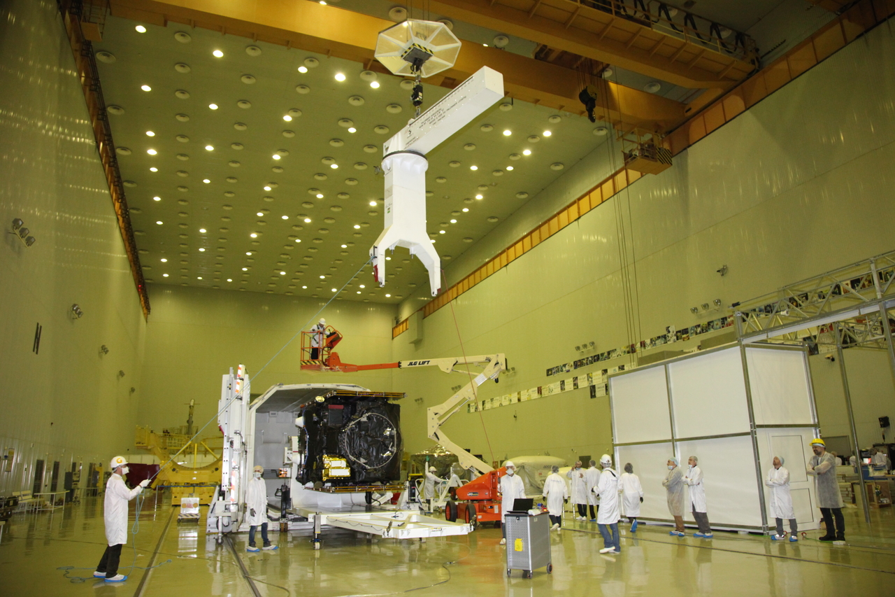 Removing the Trace Gas Orbiter (TGO) from the container in which it was transported from Europe to the Baikonur cosmodrome in Kazakhstan, in December 2015.