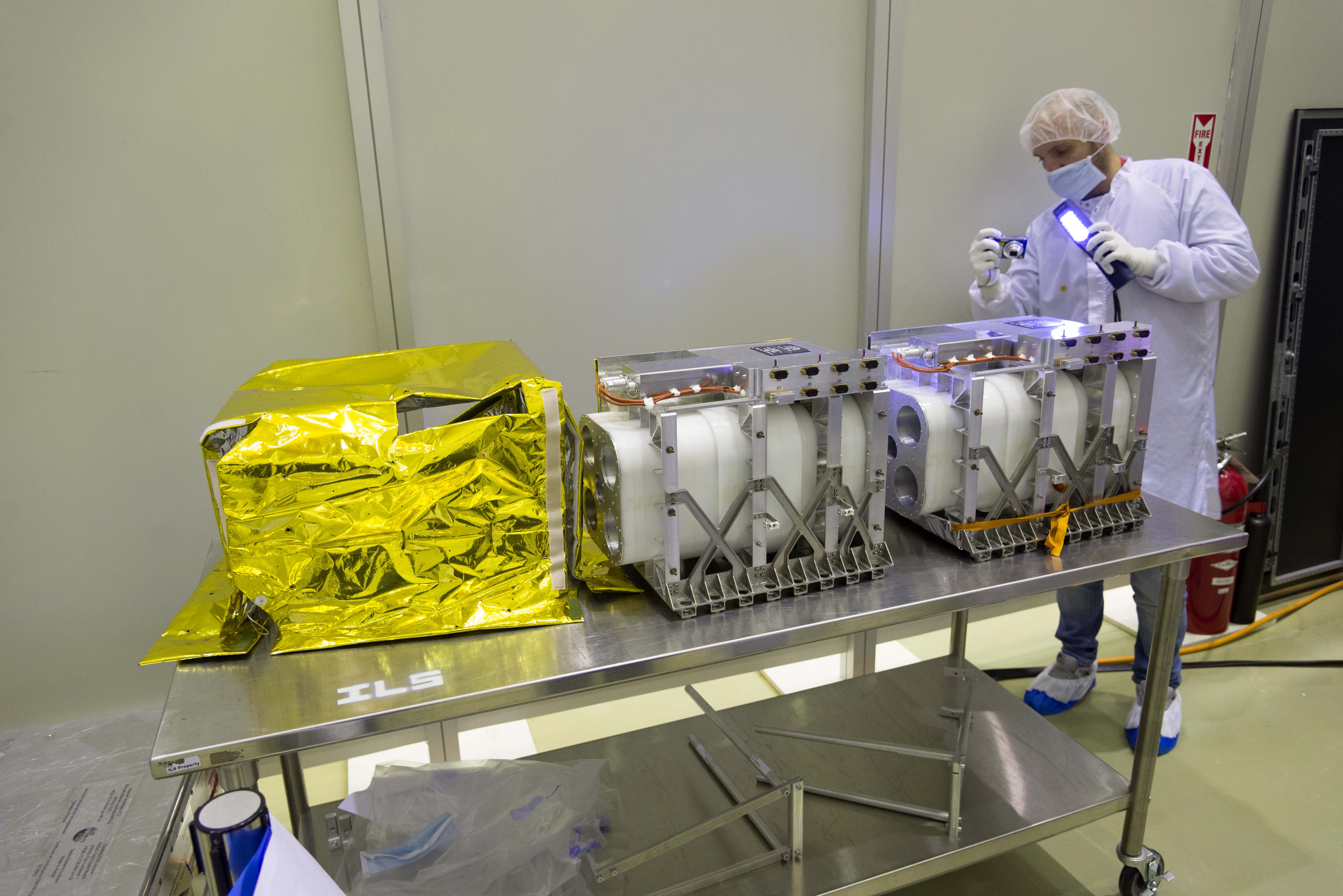 Inspection of the FREND flight model (right) on the bench after removal from the Trace Gas Orbiter. The FREND flight spare model is in the middle, and the MLI is on the left.