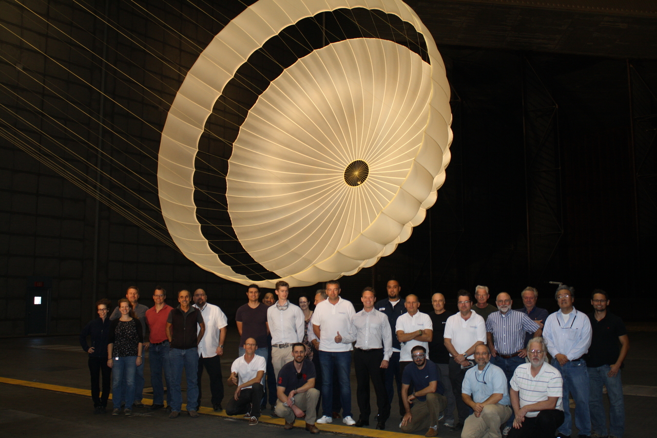 Pictured here are some of the people from ESA, industry (Thales Alenia Space Italy, Thales Alenia Space France, Vorticity, General Dynamics (USA)) and the NFAC test facility with the qualification model of Schiaparelli's parachute.