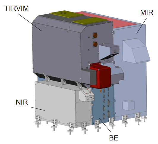 The layout of the Atmospheric Chemistry Suite (ACS) modules: TIRVIM is a Fourier-spectrometer for thermal infrared band, MIR and NIR are Echelle-spectrometers for middle and near-infrared bands respectively, and BE is the electronics module.