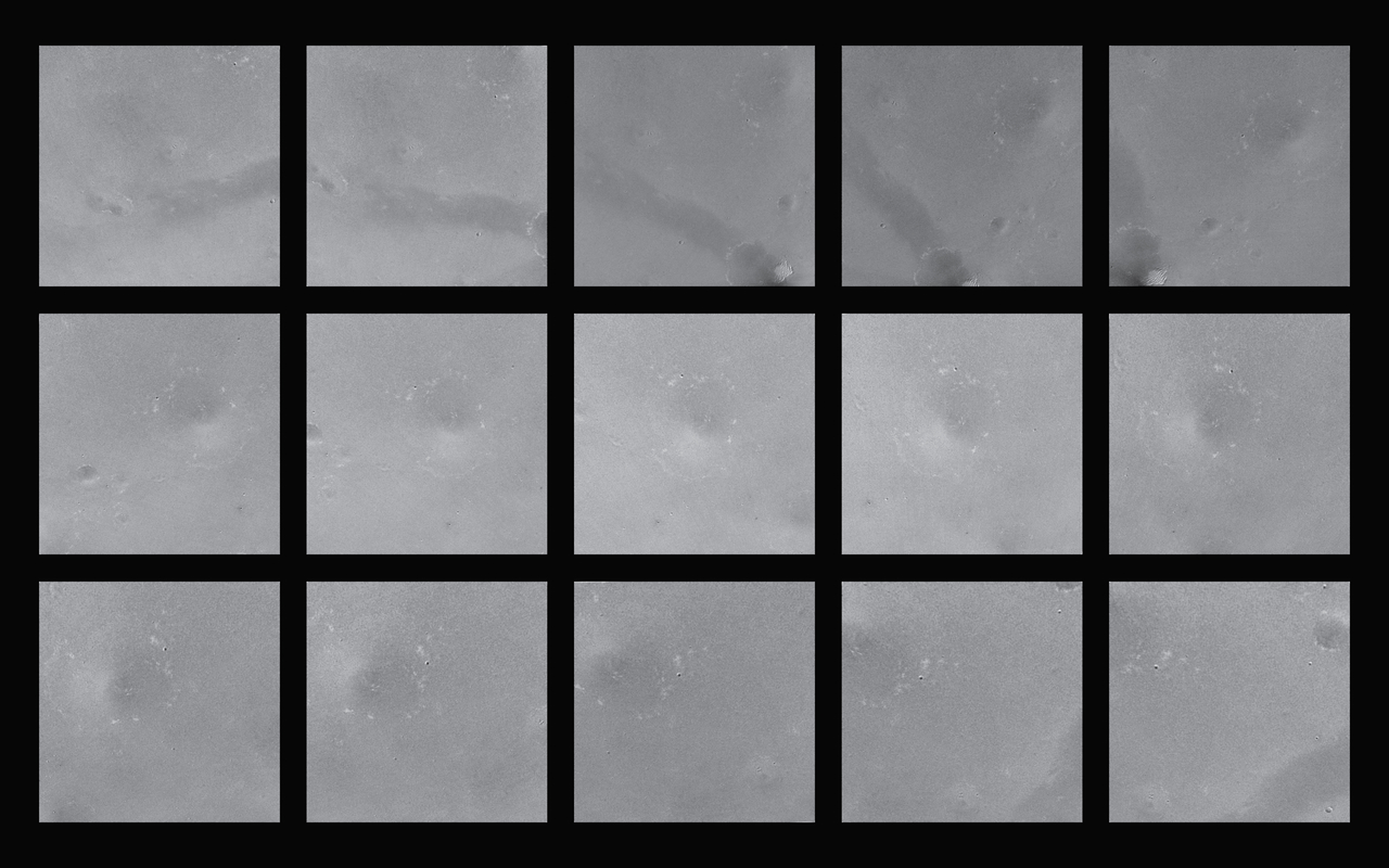 Simulated sequence of the 15 images that the descent camera on the ExoMars Schiaparelli module is expected to take during its descent to the surface of Mars on 19 October 2016. The descent camera will start taking images about one minute after the front shield has been jettisoned. In the simulated images shown here, this corresponds to the first image being taken from an altitude of about 3 km. The camera takes images every 1.5 seconds: the final image in this simulated sequence is at ~1.5 km, but depending on Schiaparelli's actual descent speed on the day, the final image may be acquired closer to the surface.