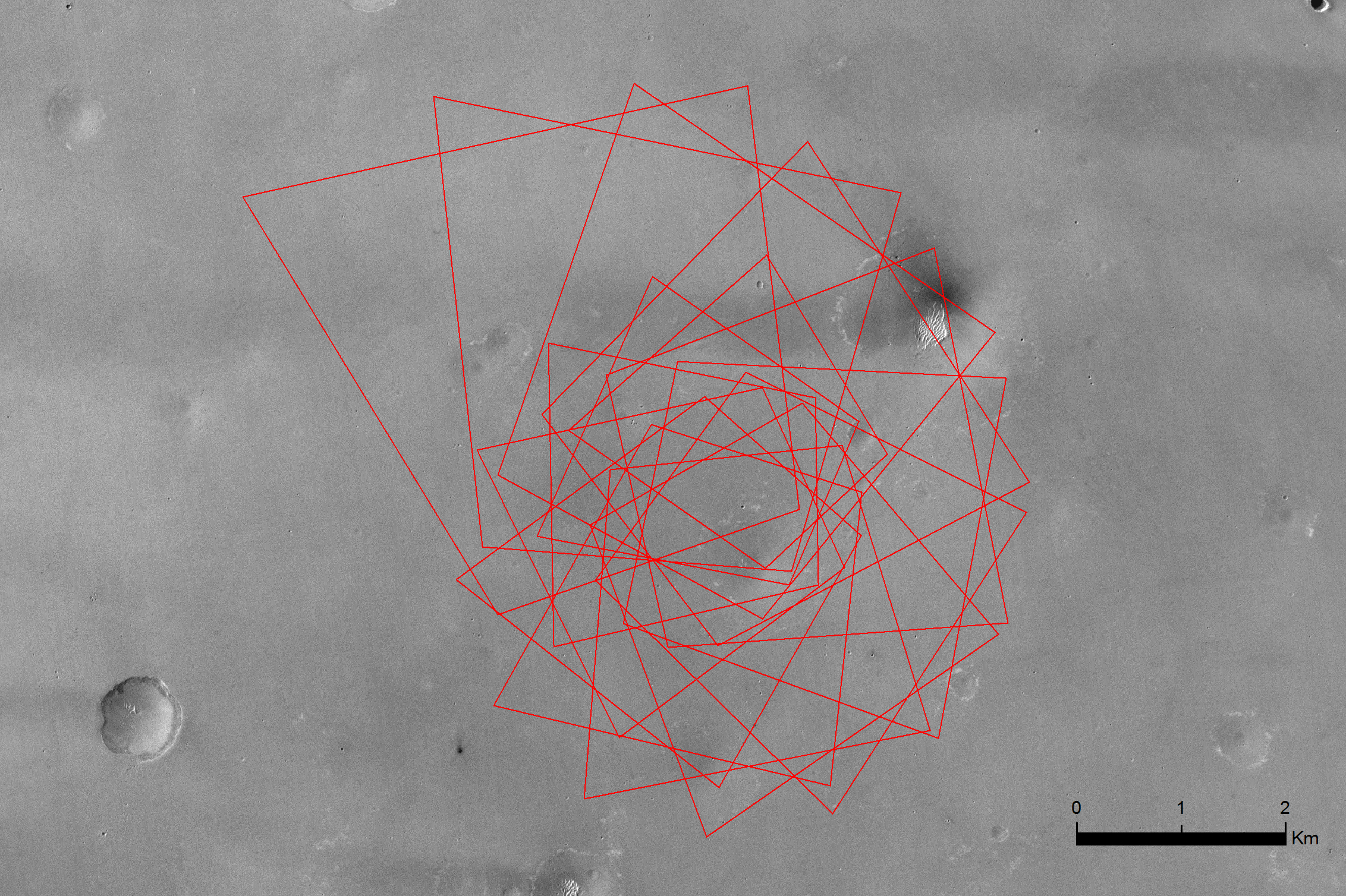In this simulation, the 'footprints' of Schiaparelli's 15 descent camera images follow a roughly clockwise order, as seen in this view from larger to smaller fields-of-view. In this simulated view, the first image is taken at about 3 km altitude and covers roughly 17 square km, while the final image is taken at about 1.5 km and covers 4.6 square km. The images are taken every 1.5 s.
