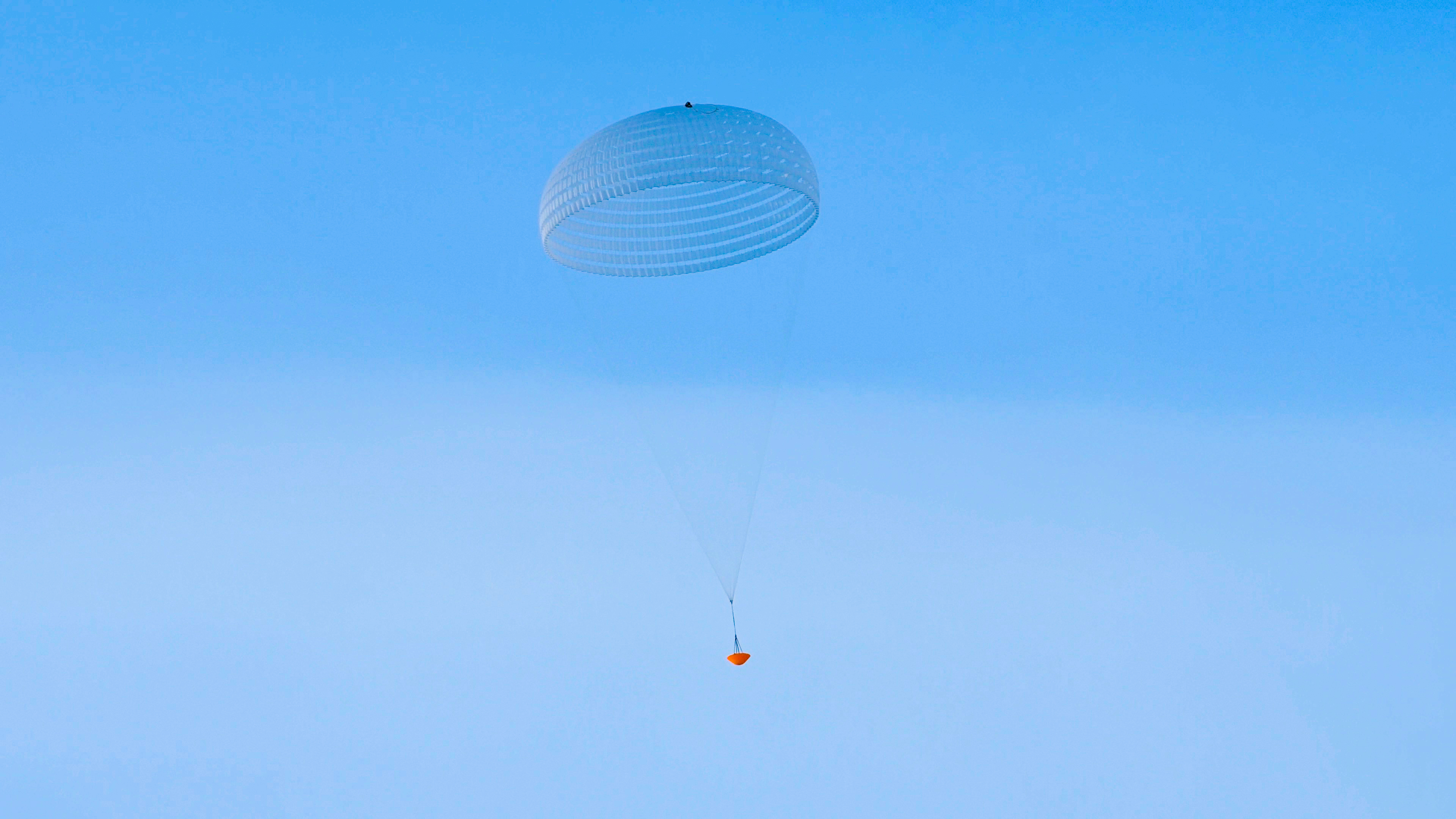 The deployment of the large 35 m-wide parachute of the upcoming ExoMars mission was tested in a low-altitude drop test earlier this month. The image captures the inflated ring-slot parachute with the drop test vehicle suspended underneath.