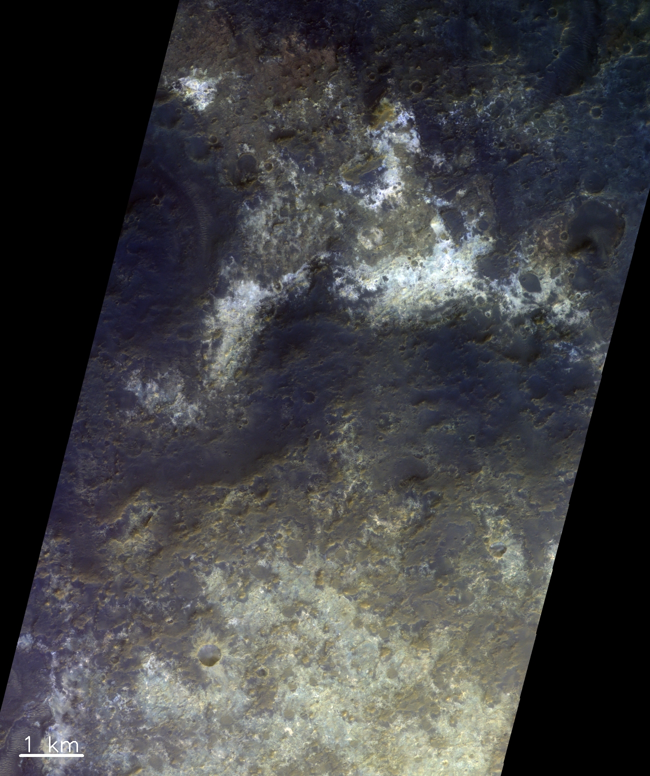This colourful image of terrain south of the Mawrth Vallis outflow channel on Mars shows the diversity of mineralogical compositions found in this region.