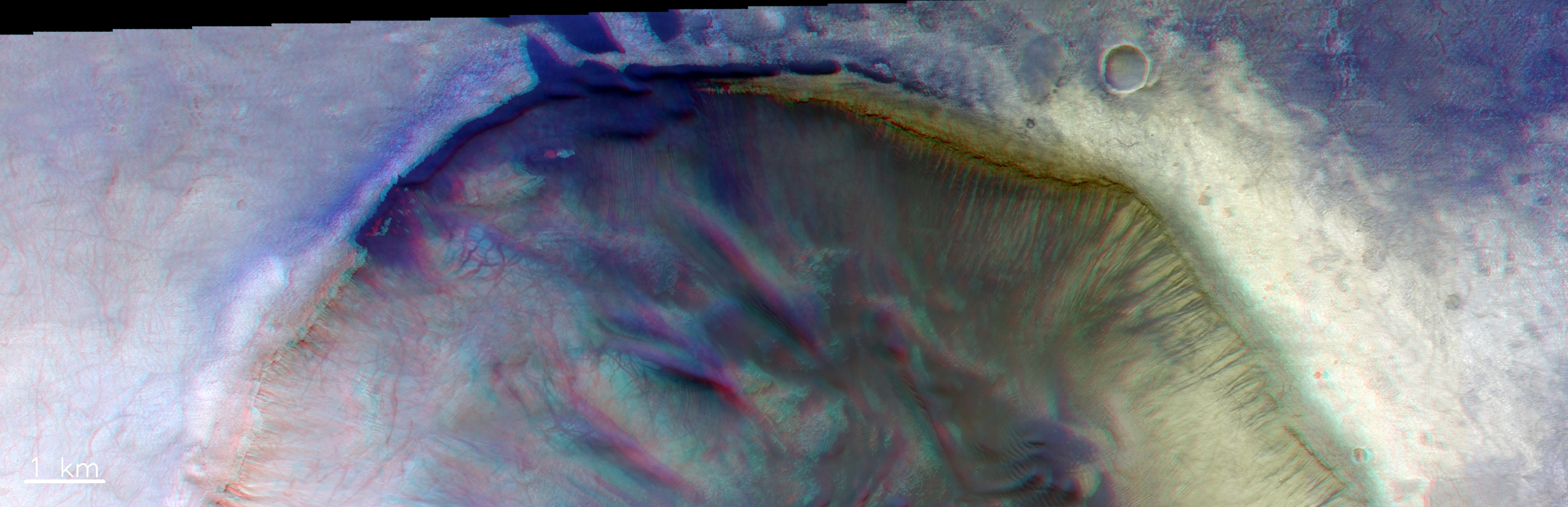 Use red-blue stereo '3D' glasses to best enjoy this view of dust dunes cascading over the edge of Green Crater, in the Noachis Terra region of Mars.