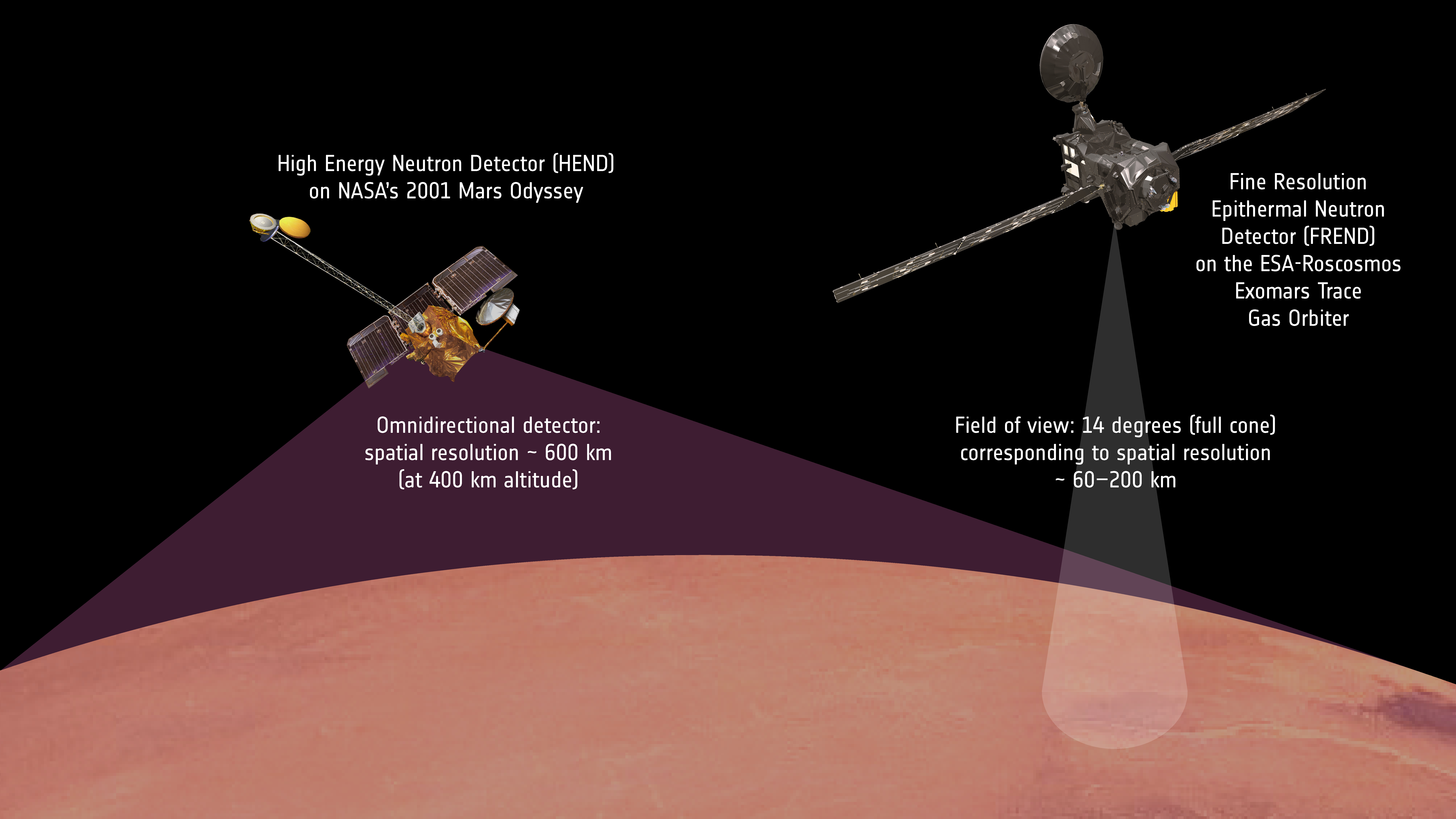 This graphic shows the improved resolution of the FREND neutron detector on board the ESA-Roscosmos ExoMars Trace Gas Orbiter with respect to its predecessor, the HEND detector on NASA's 2001 Mars Odyssey mission. As opposed to HEND's omnidirectional detector, FREND has a field of view of 14 degrees, corresponding to a spatial resolution of 60–200 km at an altitude of 400 km, depending on statistics.